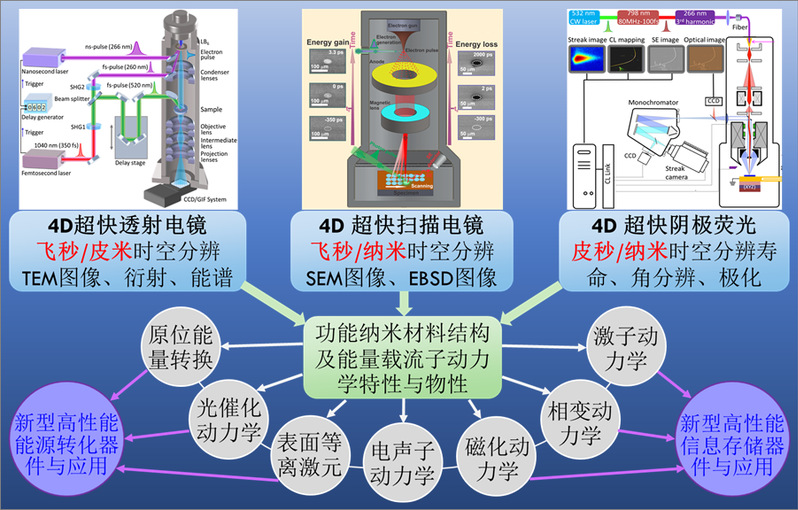 研究方向研究领域简介 物质的微观结构及其相关动力学行为从根本上决定了其物理与化学性质及潜在的功能和应用。例如功能纳米材料和人工纳米结构在能源转化、信息存储等应用中发挥作用时,其微观结构都发生着一系列复杂的物理和化学变化,涉及到形貌演化、结构相变、电荷转移、价态变化等动力学过程。这些动力学过程许多发生在飞秒(10-15 s)至纳秒(10-9 s)尺度。因此,在原子、分子尺度实时地观察物质微观结构的超快动力学过程一直是材料、物理、化学和生物等研究领域追逐的目标,也是深入理解其物性和开发新产品的关键。4D超快电子显微镜结合了电镜的超高空间分辨率和飞秒激光的超快时间分辨率,为研究物质的微观结构及其相关动力学行为提供了无限可能。其自2005年于加州理工学院(Caltech)诺奖得主Ahmed Zewail教授课题组诞生以来,已经在上述多个研究领域产生众多重要应用,成为电子显微学领域一个快速发展的新兴方向。 在91探花入口 的大力支持下,我们建立了一个国际一流的综合性4D超快电子显微镜实验室,自主设计搭建了最新一代的4D超快透射电子显微镜(4D UTEM)、超快扫描电子显微镜(USEM)、超快阴极荧光(TRCL)、微区瞬态光谱及成像(TA/TRPL)、时间分辨的磁光探测(TR-MOKE,RMCD)等超高时空分辨电子、光子成像与探测系统,旨在探索最小和最快的未知微观世界。课题组长期从事4D超快电子显微镜技术和原子/纳米尺度的超快动力学及物理研究,重点关注和发展先进的新型原位4D UTEM、USEM、TRCL、TAM、TR-MOKE等超高时空分辨的电子、光子成像与探测技术,在空前的时空尺度下研究量子与纳米功能材料在能源转换、信息存储与传输等真实应用中的形貌及晶体结构演化、能量载流子传输与相互作用等超快动力学过程与物理机制,进而开发新器件和新应用。
