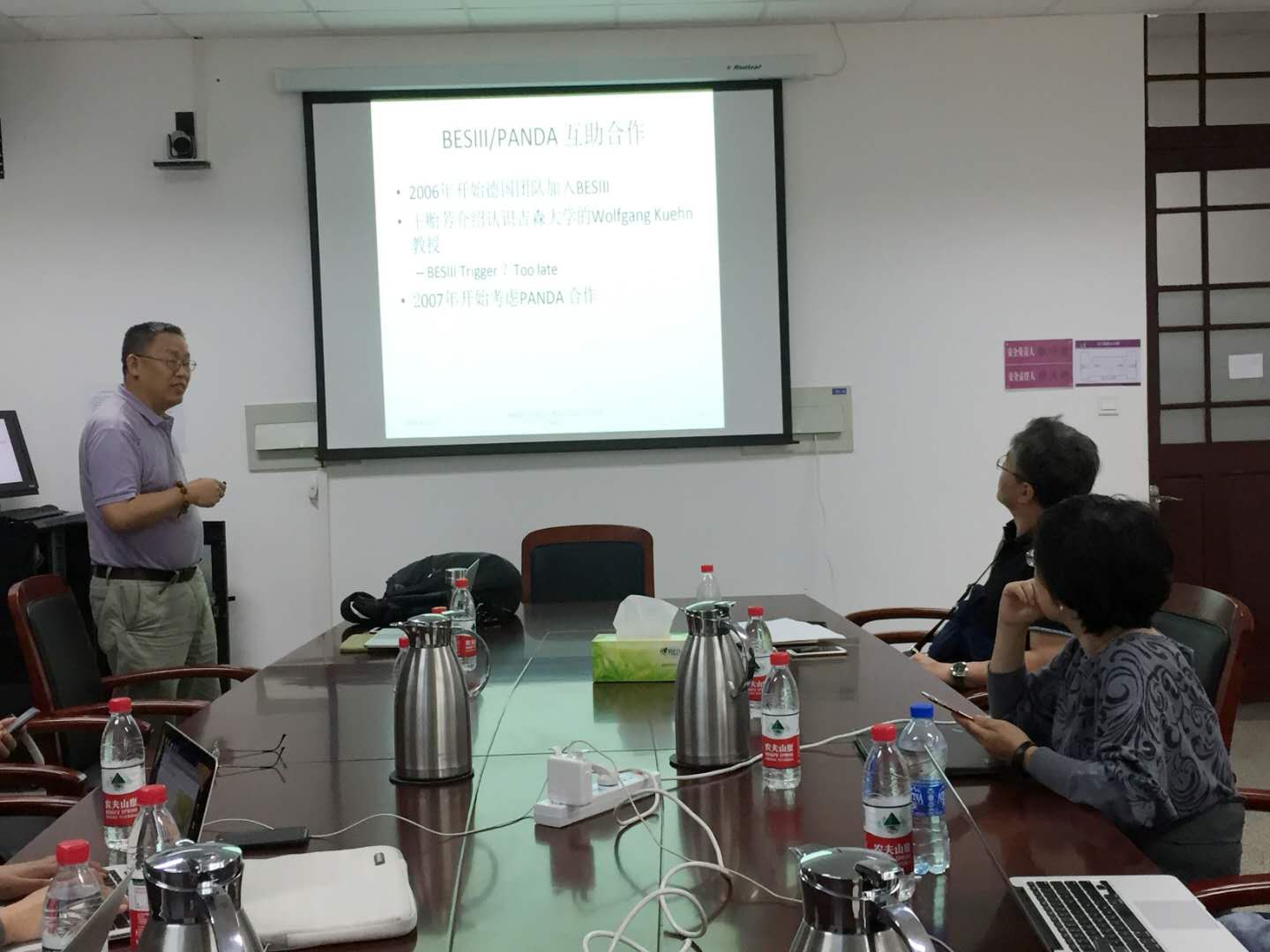 来自于高能所的孙胜森研究员、刘振安研究员分别对PANDA 实验软件及数据采集系统DAQ进行了介绍,赵光副研究员(IHEP) 对高能所的新近工作进展进行了报告。科技大学的黄光顺教授主持讨论中方团队协调规划建议,沈肖雁研究员等就如何进一步深入开展工作、申请项目等方面提出了一系列的建议。
