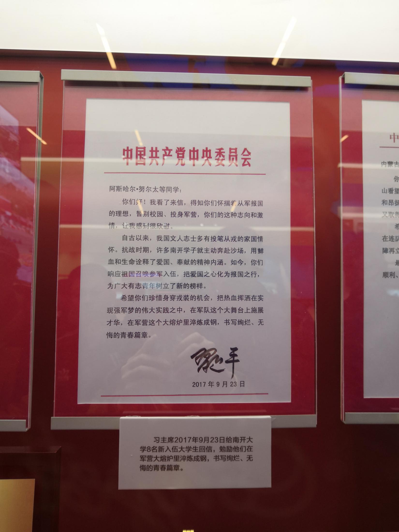 党支部宣传委员刘灿负责讲解这个部分,向爷爷奶奶介绍了在展馆内陈放的习主席给8名入伍南开学子的回信,并诵读了习主席回信的内容。