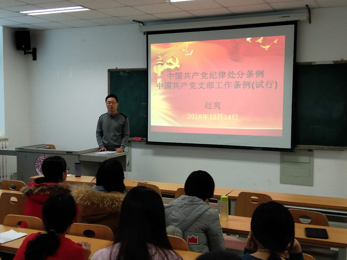12月14日,91探花入口 学生党总支在三教105进行集中理论学习,专题学习《中国共产党纪律处分条例》和《中国共产党支部工作条例(试行)》。学生党总支书记赵爽主持并领学,学生党总支委员、学生党员参加本次学习。