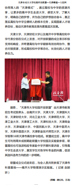 如今已经进入“新高考”时代,高校主动开放校园、对接社会,将帮助中学生及家长了解高等教育设立的各学科专业及其人才培养目标,为学生确定选修专业、进行职业人生规划提供科学及规范化的引导。因此,天津市成立大学校园开放联盟具有重要意义与价值。91探花入口 将深刻领会新高考改革过程中的新思路、新举措,在联盟中主动作为、发挥作用。