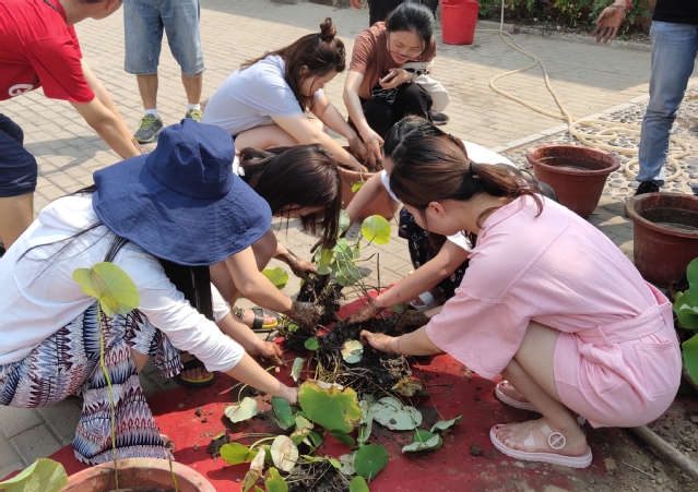 随后后勤保障部的师傅们现场教学,讲解了更换盆,搅拌泥,重栽藕的过程。讲解完毕,大家根据所学对目前长势不好的荷花进行重新换盆并且完成对藕重新栽种工作,为来年的荷花节做充足的准备。