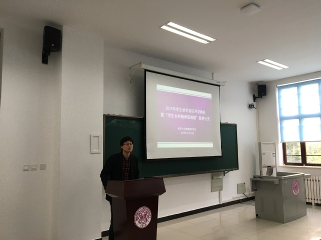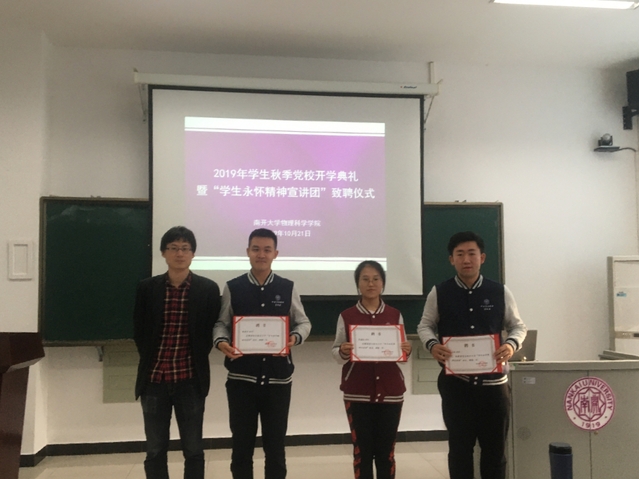 典礼开始,张学良向全体学员强调了本次党校的培训纪律,并对大家今后学习的努力方向给予针对性指导。张学良表示,希望各位党员和预备党员珍惜本次集中学习的机会,真正使自己在理论功底、知识水平、党性修养和业务能力都有一个新的提高,顺利完成培训任务并结业。随后,张学良为“学生永怀精神宣讲团”颁发聘书。宣讲团的辛琦、王天皓和任涵钰同学,为党校学员带来了郭永怀事迹和精神宣讲。主题宣讲以物理系校友,“两弹一星功勋”烈士郭永怀的事迹为主线,向大家介绍了郭永怀无私奉献、以身许国的家国情怀。同学们纷纷表示,听到了郭永怀校友的事迹,十分感动,在今后的学习工作中,必将秉持“将小我融入大我”的大公精神,成为知行合一、格物致理的南开物理人。