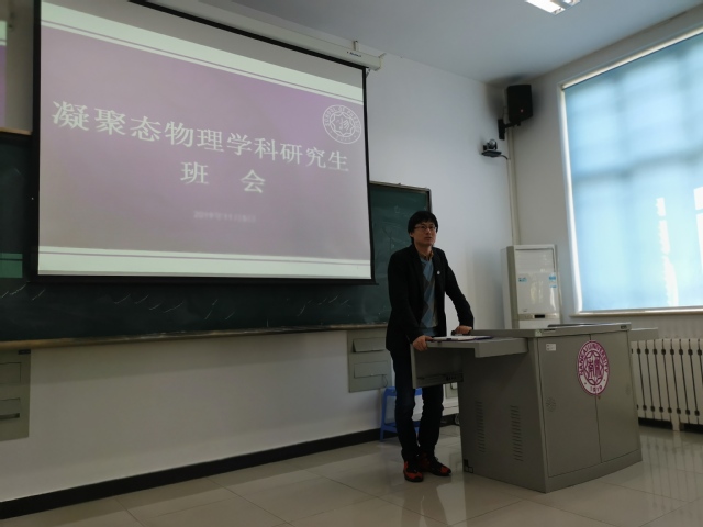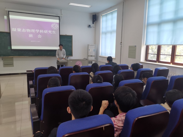11月5日,91探花入口 举行凝聚态物理学科研究生班会,学院党委副书记兼副院长张学良、凝聚态物理学科负责人胡振芃、研究生辅导员阎宝岩及近百名研究生参加。