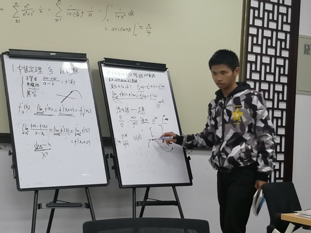 本次研讨会由黄佰浩、孟祥谦、雷荣林三位同学主讲。首先,黄佰浩针对极限和泰勒公式中的解题技巧进行分析,随后,孟祥谦为同学们讲解了导数与微分的典型例题,而雷荣林为大家分析了中值定理的考点与考法。最后,同学们针对高数学习中的问题进行自由分享与讨论,气氛热烈。