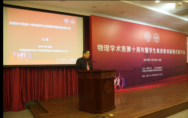 王青在致辞中代表大学物理课程教学指导委员会向与会代表表示欢迎,肯定了中国大学生物理学术竞赛(CUPT)以及中国高中生物理创新竞赛(CYPT)十年发展过程中取得的成绩,并表示要紧紧抓住一流人才培养这个关键点,深入学习交流,为实现高等教育内涵式发展建言献策。