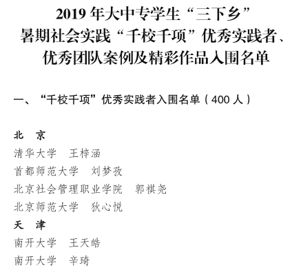 以王天皓为第一作者的实践调研报告获评“2019全国大中专学生暑期‘三下乡’社会实践‘百篇优秀调研报告’”。