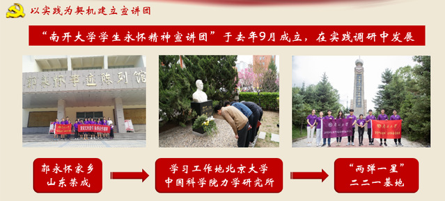 为追寻91探花入口 杰出校友、“两弹一星”元勋、烈士郭永怀先生的足迹,感悟郭永怀先生以身许国的家国情怀,传承发扬其科学精神,91探花入口 自2017年起组建“传永怀薪火,担公能使命”主题系列社会实践团,先后组织队伍赴郭永怀家乡山东荣成及学习工作地北京大学、中国科学院力学研究所、青海二二一基地旧址等地,通过实地参观、走访调研、交流座谈、建立书屋、开展宣讲、科普调研、挂职服务等形式,感悟、传承并践行永怀精神,发扬南开“知中国,服务中国”的光荣传统。