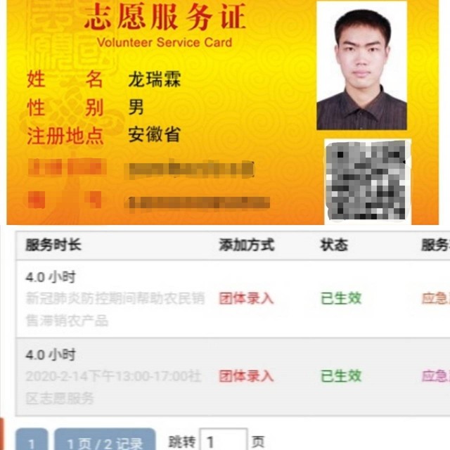 在得知家乡疫情发展情况后,主动要求加入家庭所在地的颜家太洛村志愿团队,在村口记录人员进出情况,劝返异地人员来访,宣传科学知识,号召村民理性面对疫情。