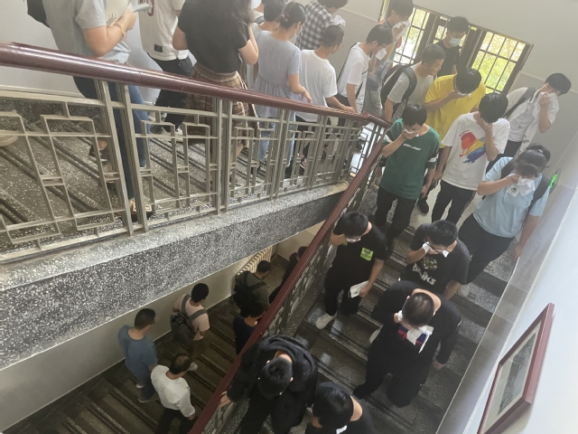 “叮铃铃铃铃……”,下午三点,伴随消防警报声响起,模拟火灾烟雾升起,应急疏散演练在第三教学楼正式开始。师生在指引和协助下,用湿毛巾捂住口鼻,根据逃生指示标志,从紧急出口紧张有序地撤离到安全地带。