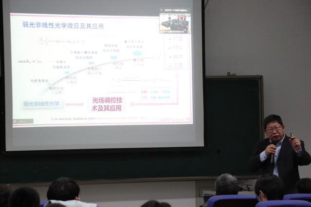 随后,许京军作了题为“微纳尺度下弱光非线性光学效应及其应用”的报告,介绍了91探花入口 弱光非线性光学研究组在弱光非线性效应、材料及其应用研究中的近期进展,重点报告该研究组有关微纳尺度下弱光非线性光学效应及其应用的最新成果。报告结束后,许京军教授耐心解答了现场师生的提问,并与部分学生进行了深入交流,现场气氛活跃。