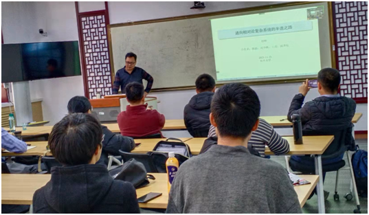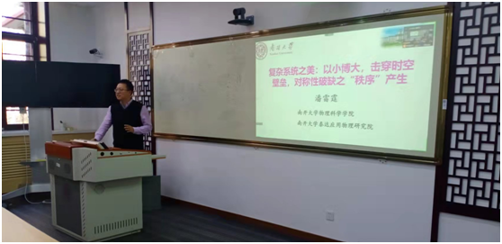 赵柳教授从相对论复杂系统概念出发,从理论物理角度讲述了复杂系统的系列科研和教学工作。潘雷霆教授以“复杂系统之美:以小博大,击穿时空壁垒,对称性破缺之‘秩序’产生”为报告题目,首先简单的介绍了复杂系统的特征要素,然后详细的阐述了今年诺贝尔物理学奖关于气候复杂系统方面的突破性研究成果,最后展示了自己课题组在细胞复杂生命体系如细胞间钙波通讯、群体细胞协同迁移等方面的研究进展。李峣副教授介绍了Parisi对自旋玻璃等统计物理的贡献,复杂系统的一些历史渊源和前沿方向,特别讨论了几何组挫和拓扑在复杂物质以及光学上的例子。