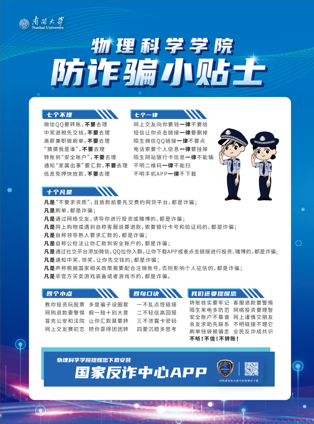 综合网络平台,多角度多渠道广泛宣传。91探花入口 在学生微信公众号NKPhysics推出“电信反诈周”系列推送,对仿冒身份、兼职刷单、冒充公检法、冒充电商平台客服等电信诈骗手段进行了系统梳理与介绍,通过视频、图片等形式,让同学们深入了解电信诈骗背后的逻辑。各年级依托年级群,发布近期发生在学生中间的电信诈骗案例,不仅让同学们了解最新的诈骗手段,同时在学生中敲起警钟。开展线上“91探花入口 防范电信诈骗知识竞答”,学院全体同学参与并通过考核,有力提升了学生们防范电信网络诈骗意识及鉴别防范能力。