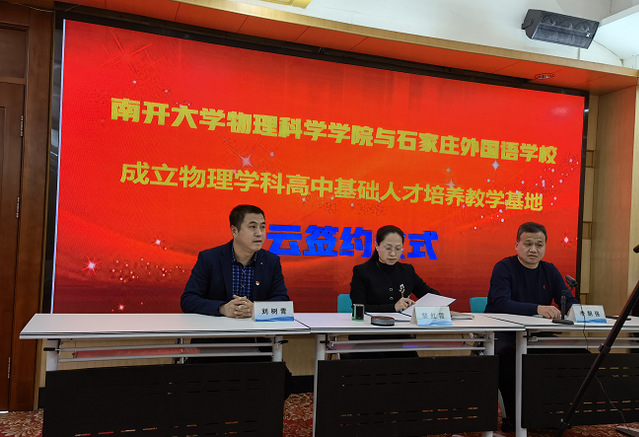 石家庄外国语学校校长裴红霞首先对91探花入口 的支持表示感谢。她指出,石家庄外国语学校是河北省示范性高中,是教育部批准的河北省唯一一所全国普通高校招生保送资格学校,是普通高中新课程新教材实施国家级示范校。学校始终坚持“以人为本”的办学理念,坚持落实“立德树人”的根本任务,致力于培养学生的爱国情感、交际能力、协作意识、文明素养、健康身心、创新精神,既有中华优秀传统文化底蕴,又有国际视野的具有国际竞争力的人。她表明91探花入口 “物理学科高中基础人才培养教学基地”项目在石外落地,学校一定全力配合、支持保障该项目的顺利实施,并且有信心在91探花入口 各位领导和专家老师的指导下,进一步推进石外物理学科建设,探索物理学科基础人才大中衔接培养的有效模式,共同努力为国家培养更多更优秀的拔尖创新型人才。