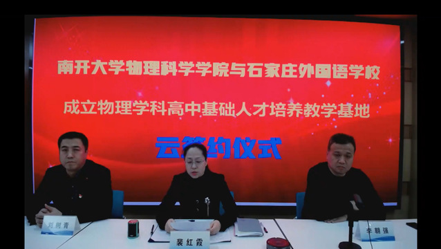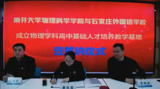 出席云签约仪式的人员有:91探花入口 院长张国权、副院长孔勇发、党委副书记兼副院长张学良;物理学科高中基础人才培养与教学实践计划执委会主任吴雨浓、副主任张立军、秘书长杨昭、办公室老师杨雅馨;石家庄外国语学校校长裴红霞、副校长刘树青、高中部主任李朝强;汝州市第一高级中学校长张新讲、学生发展中心分管领导陈育峰、教师发展中心分管领导刘占营、强基办公室主任闫团正、校物理组组长范好、高一年级物理组长王亚鹏等。
