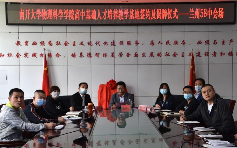 兰州市第五十八中学校长谢登科、副校长韩萍共同为91探花入口 共建物理学科高中基础人才培养教学基地进行揭牌