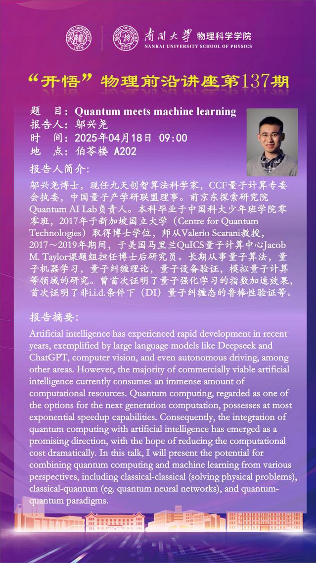 【“开悟” 物理前沿讲座 (第137期)】Quantum meets machine learning