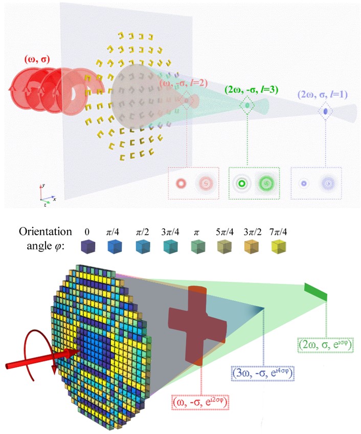 图4. 电介质微结构具有高效率、多极电磁谐振同时调控的优势, 4. 微结构非线性光场调控非线性光学自激光器诞生以来得到了快速发展并逐渐成为了光学领域的一门重要分支。传统光学晶体由于非线性材料本征极化率低的特点,需要很长的光与晶体相互作用距离,即便引入相位匹配,对作用距离的需求依然无法避免。这一特点严重阻碍了非线性光学在微纳领域的应用及集成。利用超表面优良的局域场增强能力可以在纳米尺寸激发出非线性光学信号,此外,由于尺寸超薄,不需要考虑相位匹配问题,大大提高了超表面的设计灵活性。更为重要的是,超表面能够完全控制产生的非线性光学信号,包括振幅、偏振、相位,甚至还可以做联合调控,这是传统晶体无法实现的。我们利用非线性超表面引入频率维度,可以有效的提高信道数量,通过检偏不同频率及自旋态的组合,可以得到不同拓扑荷数的涡旋光聚焦在不同的焦平面上,同时提出了一种简化的干涉方法,利用±1阶相位掩模板,光的能量主要集中在±1阶衍射级上并能够实现自干涉,由此方便地得到了非线性光的拓扑荷数 [Laser Photonics Rev.12, 1800164 (2018)]; 我们首次将编码超表面的概念拓展到非线性光学领域,同时实现了基频、二倍频和三倍频不同比特数的编码,并实现了基于不同编码非线性光的全息图生成 [Laser Photonics Rev. 13, 1900045 (2019)];我们提出了一种结合了法诺共振与模式匹配的杂化超表面来提高二次谐波的转化效率,一方面,二次谐波受益于微结构在基频与二倍频均有谐振响应;另一方面,通过调节法诺共振在二倍频波长处,等离激元结构既可以在该波长处提供局域场增强又可以提供高散射能力以适配产生的二次谐波的辐射 [Opt. Lett. 42, 3117 (2017)]。