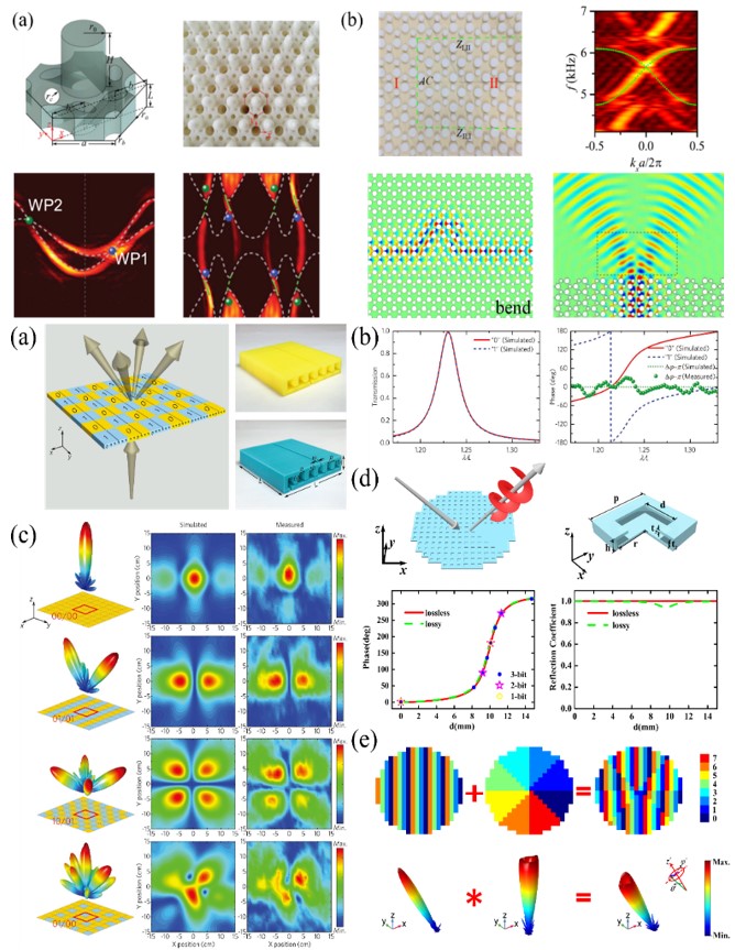 图5. 人工微结构与光场相互作用可以激发非线性效应,非线性波前调控与结构的对称性、非线性光的偏振性、非线性光的阶数有关系,在提高非线性光信息传输的阶数与通道数方面有明显优势。 5. 人工微结构声场调控 近年来,声子晶体和声学超材料得到了飞速的发展。与光子晶体和电磁超材料类似,声子晶体和声学超材料可以极大地拓展人们对声波的调控手段。传统的超材料在实际应用中存在体积较大,制备过程复杂等问题。为了克服这些问题,研究人员设计了一种平面型声学超材料,即声学超表面,其声学性质取决于其结构参数,通过对结构参数的任意设置,可以实现对声波的任意操控,同时其亚波长的厚度和灵活的声波操控能力使它在集成声学器件领域具有巨大的应用潜力。通过对声结构的排布设计尤其是超表面的设计,可以实现声波前的控制,其中包括异常反射和透射现象、聚焦与成像、特殊声束产生等,在声源设计、超声探测和声镊操纵等领域有重大的应用价值。外尔点是拓扑半金属能带的基本结构,即三维动量空间携带量子化拓扑荷的能带双重简并点。第二类外尔点是一种特殊的外尔点,其能带色散沿一个方向强烈倾斜,并在能带连接处具有锥型的费米面。我们通过设计制造堆叠手性声子晶体,首次完成了第二类外尔声子晶体实验工作,观测到了外尔频率上的拓扑转变和外尔频率间的费米孤。外尔声子晶体有望应用在降低界面和尖锐拐角的反射,而第二类外尔声子晶体由于同时具有表面模式和体模式,有望进一步拓宽外尔声子晶体在非对称波导和低反射异常折射中的应用 [Phys. Rev. Lett. 122, 104302 (2019)];我们还利用基于凯库勒晶格的声子晶体构建了声学拓扑绝缘体,该声子晶体内部的声子具有非平庸的拓扑效应,这类拓扑效应受晶格对称保护而无需破坏时间反演对称。我们利用该声子晶体的拓扑折射特性,得到了单束、对称和反对称双束及多束辐射的声天线模式。相较于用超表面或超材料的方式,该拓扑系统具有不依赖波源、能量损耗小、稳定性高的特点,未来有可能用于水下通信、超声探测等领域 [Phys. Rev. Appl. 11, 044086 (2019)]。我们首次实现了针对单声波频率具有稳定相位延迟分别为 0和 π的两种结构单元,并将这两种结构单元分别与二进制编码的“0”和“1”相对应,通过控制“0”和“1”的排布,实现了透射波远场分布控制、声波聚焦和非对称传播等功能。该设计具有非常高灵活性和自由度,为声学天线、隐身材料、透镜、声波调制器和声二极管等器件的研发集成提供了新的前进方向 [Adv. Mater. 29, 1603507 (2017);Phys. Rev. Appl. 7, 024010 (2017)]。我们进一步提出了反射式的多比特声学编码人工结构,通过利用声学编码超表面对声波调控的叠加原理,实现了对反射声波远场形状操控,声波异常反射,并且生成了方向可控的涡旋声波,这种声学编码人工结构在室内降噪、声场调控以及粒子捕获等领域都有广阔的应用前景 [Appl. Phys. Lett. 114, 091905 (2019)]。